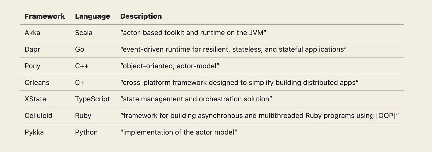 Thankfully, the industry has started bridging the gap between the usefulness of this Actor Model and its adoption complexity by creating languages and frameworks. These preserve the actors’ tenets while making them easier to implement.