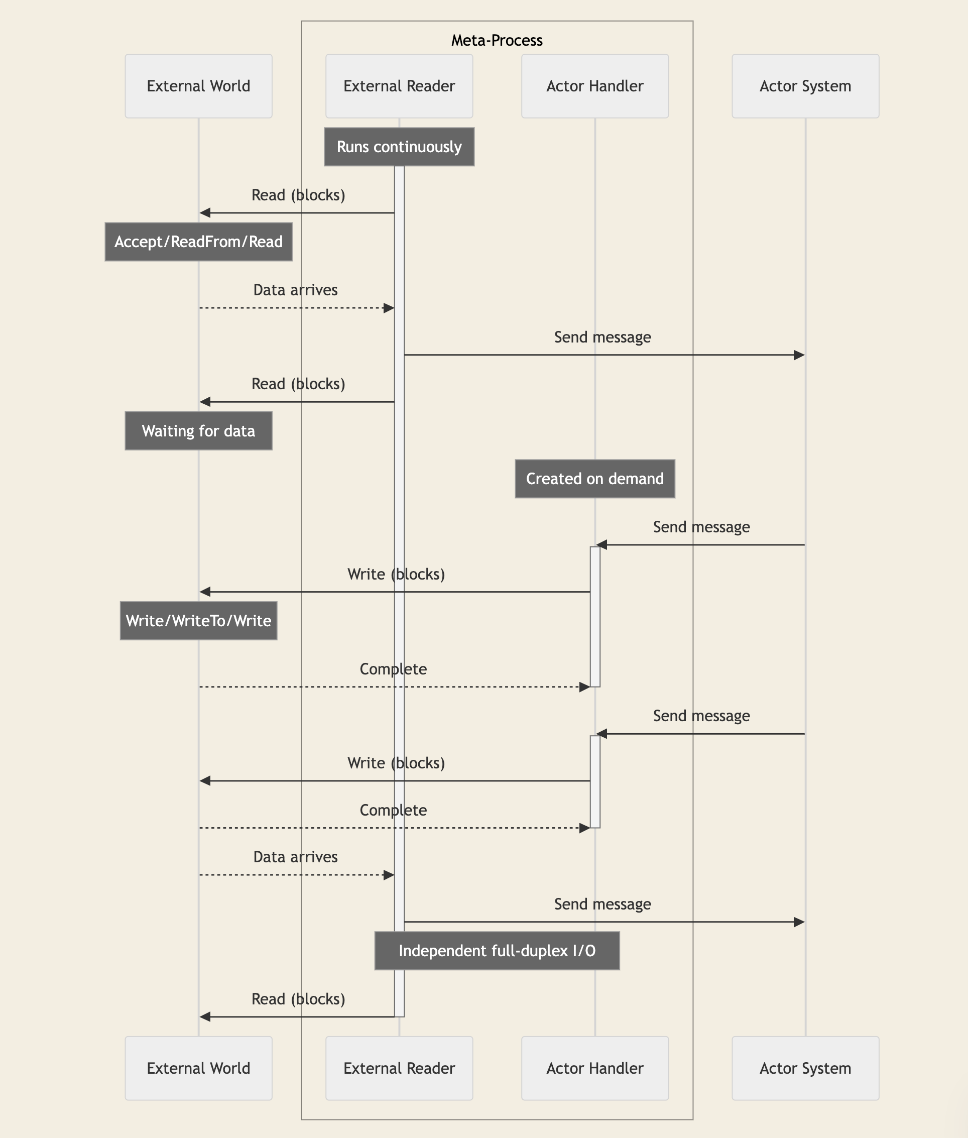 Unlike normal processes, which have one goroutine per process, Meta-processes have two: a Reader and a Handler. The reader is for blocking operations — Accept() loops, ReadFrom() calls. The handler does everything except I/O via sequential messages in traditional Actor fashion. The Reader runs continuously from spawn until termination. The Handler comes and goes based on message traffic.