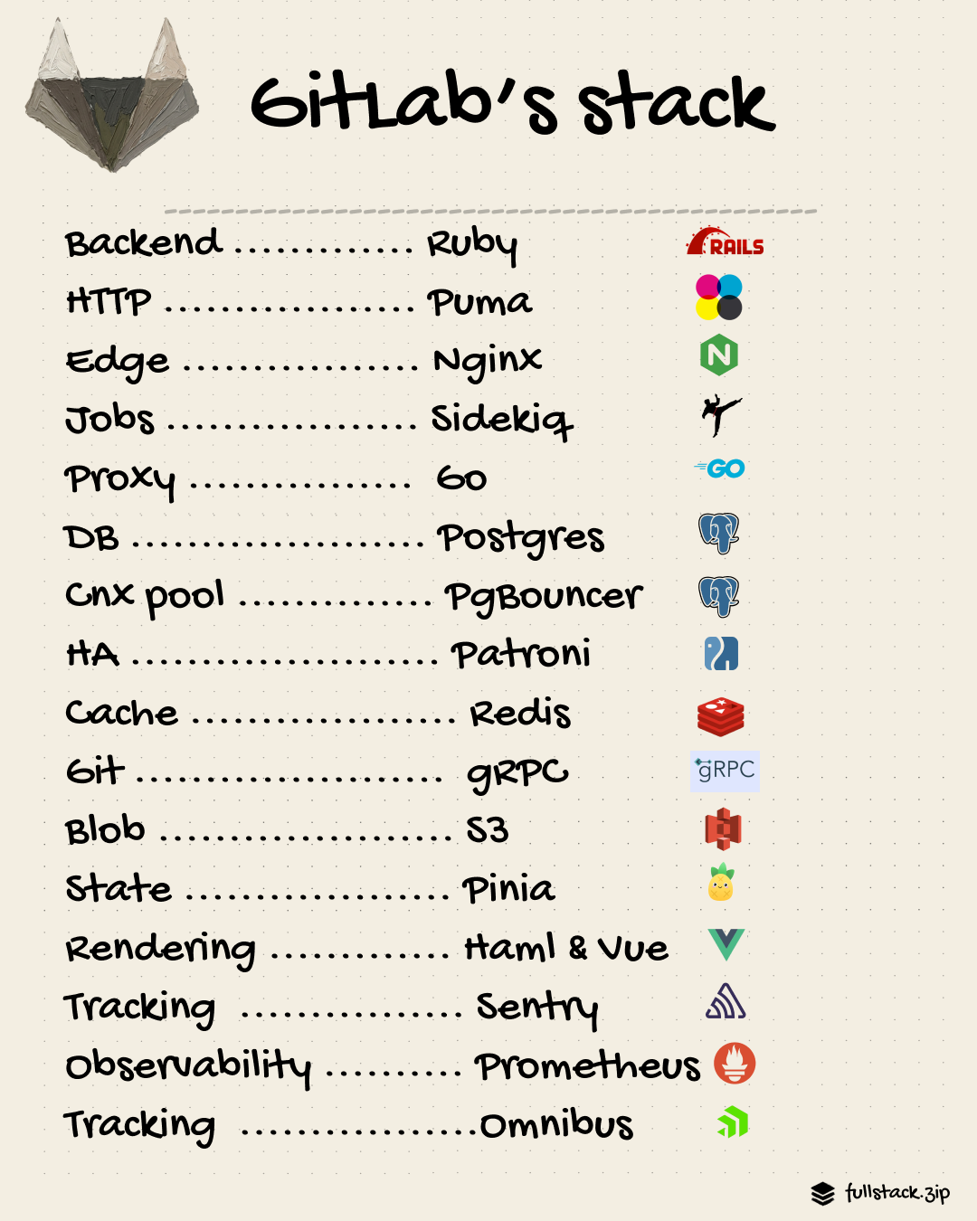 GitLab is what happens when you commit to the monolith. Its CI/CD, security scanner, issue tracker, and deployment toolchain are bundled into one product rather than five held together with webhook glue. The stack isn’t flashy either: a large Ruby on Rails app, Postgres, Redis, and a handful of Go services.
