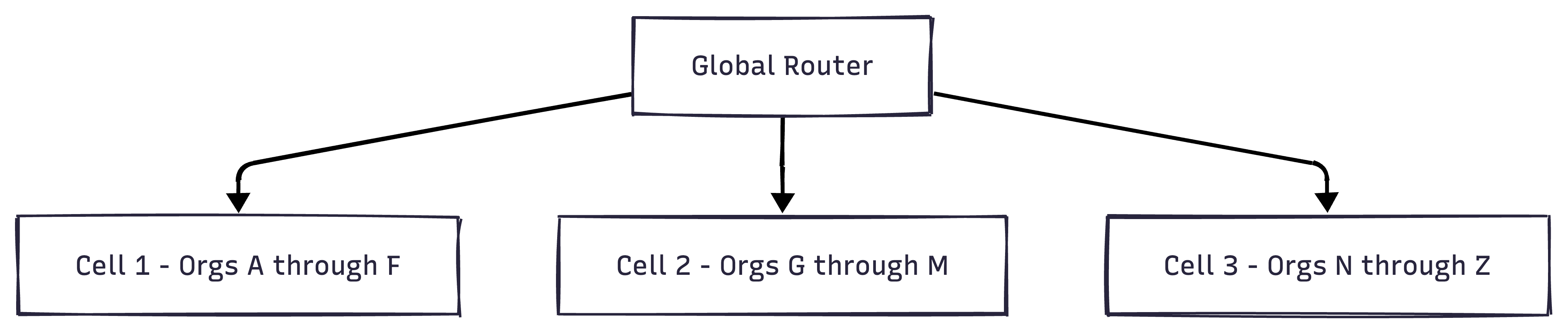 An org is assigned to exactly one Cell. The global router resolves which Cell handles each request based on the org in the URL. Each Cell is essentially a complete, isolated GitLab instance. Adding capacity means adding a new Cell — no resharding or cross-shard coordination.