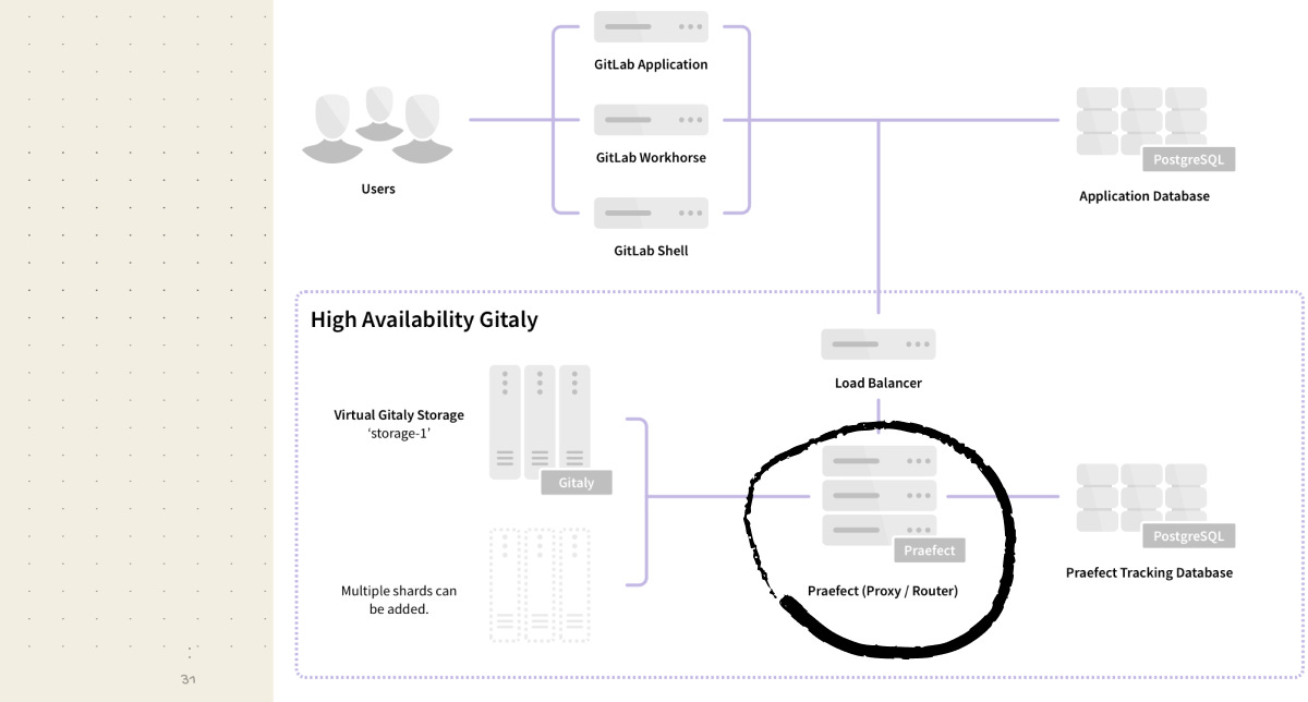 Gitaly Cluster / Praefect — GitLab Docs | Replication proxy, quorum writes, and automatic failover.