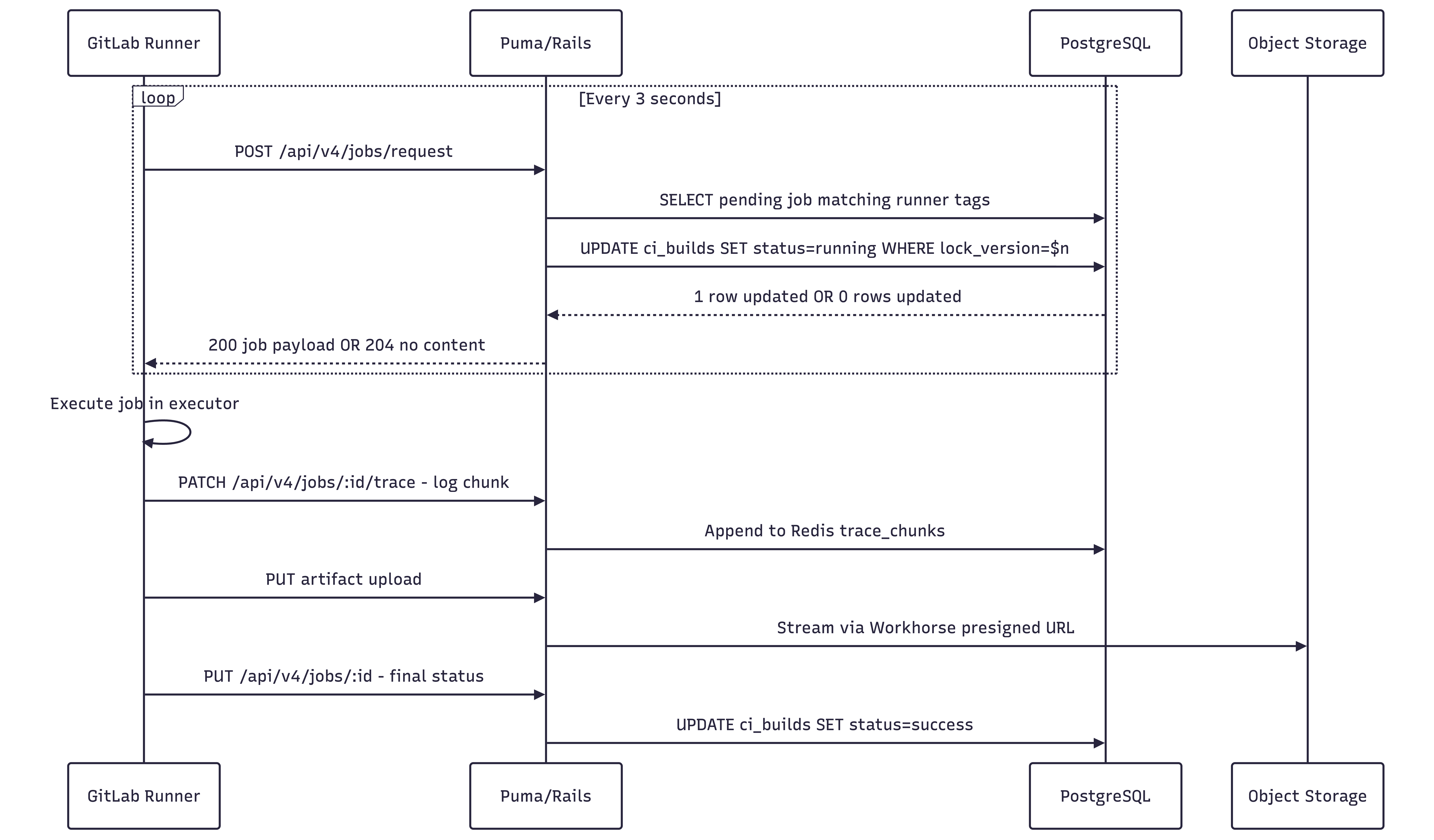 Runners poll POST /api/jobs/request every ~3 seconds. On the Rails side, this hits Ci::RegisterJobService, which: