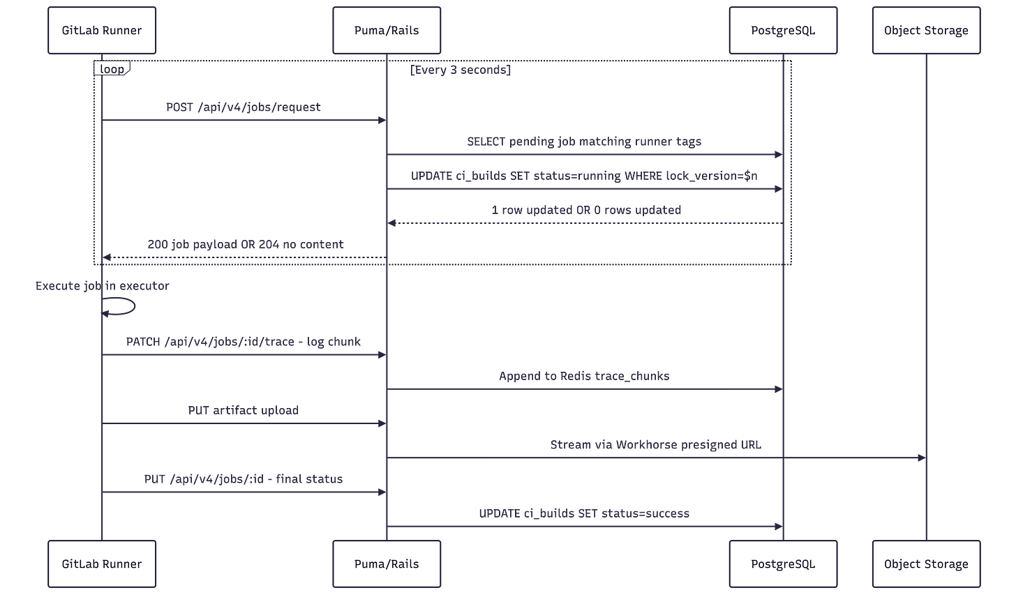 AND lock_version = $3; -- ← the OCC checkIf another Rails process already picked this job (incrementing lock_version), this UPDATE matches zero rows. The service detects the miss and returns 204 No Content to the runner, which simply tries again on the next poll cycle. No deadlock, global lock, or serialization. Conflicts are rare, and when they do occur, only one poll cycle is wasted.