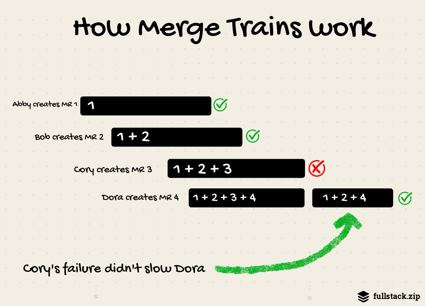 While this “speculative thing on top of another speculative thing” got the banks in trouble in 2008, GitLab thankfully hedges risk a little more responsibly. Think: automatic rebasing, hiding speculative future states, fast forwarding, juggling Git and MR refs, capping parallel pipelines (to 20). It required years of behind-the-scenes work.
