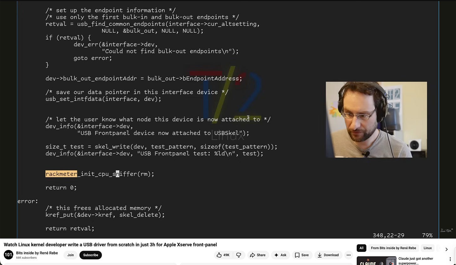 Watch Linux kernel developer write a USB driver from scratch in just 3h for Apple Xserve front-panel (youtube)